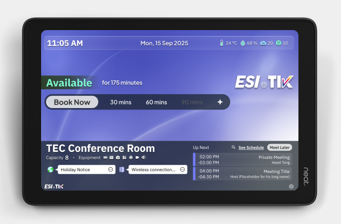 From a single floor to a global campus, ESi-Tik integrates with Neat Pad and Neat Frame to bring intelligent facility management tools directly into the physical workspace. The ESi-Tik App is now available for direct installation from the Neat App Hub.